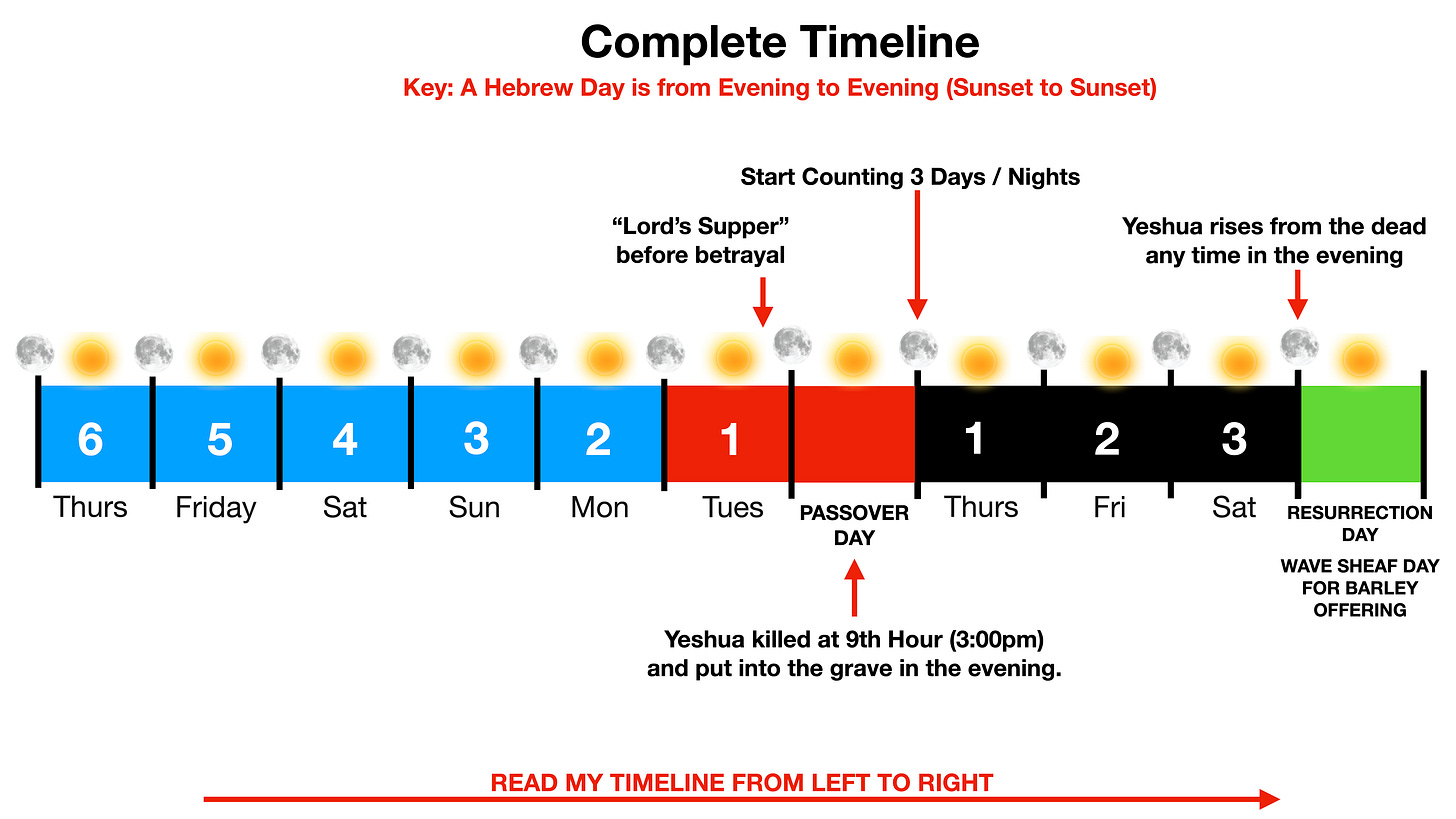 Here, we see that the tomb was already empty on Sunday, which is why we refer to this day as resurrection Sunday. Now, all we have to do is work backwards to understand when Jesus was put to death three days and three nights earlier. I will illustrate these things on a timeline.