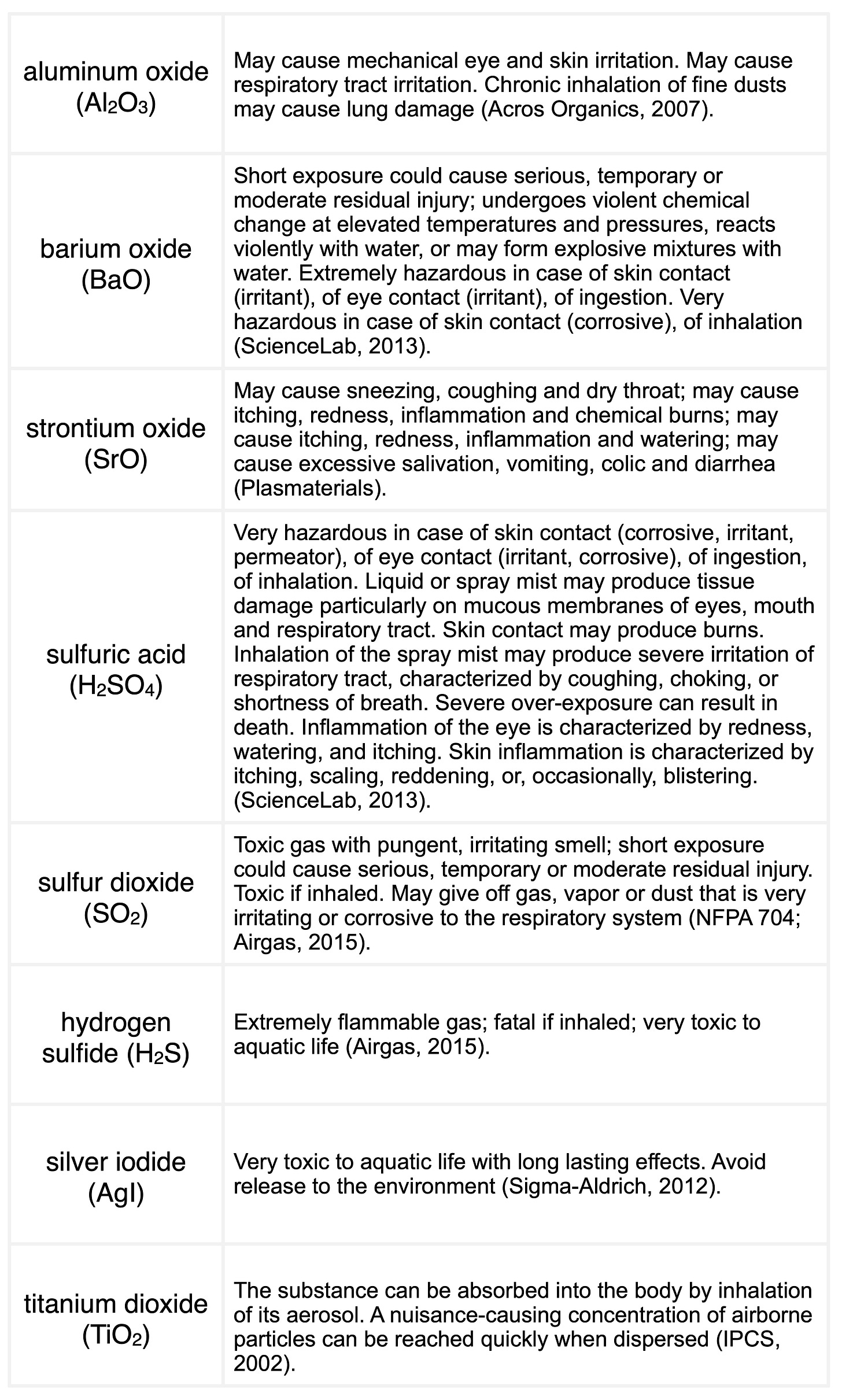 Table 1: Some of the suspected geoengineering chemicals with accompanying general overview of NFPA, SDS, ICSC, and/or MSDS descriptions.