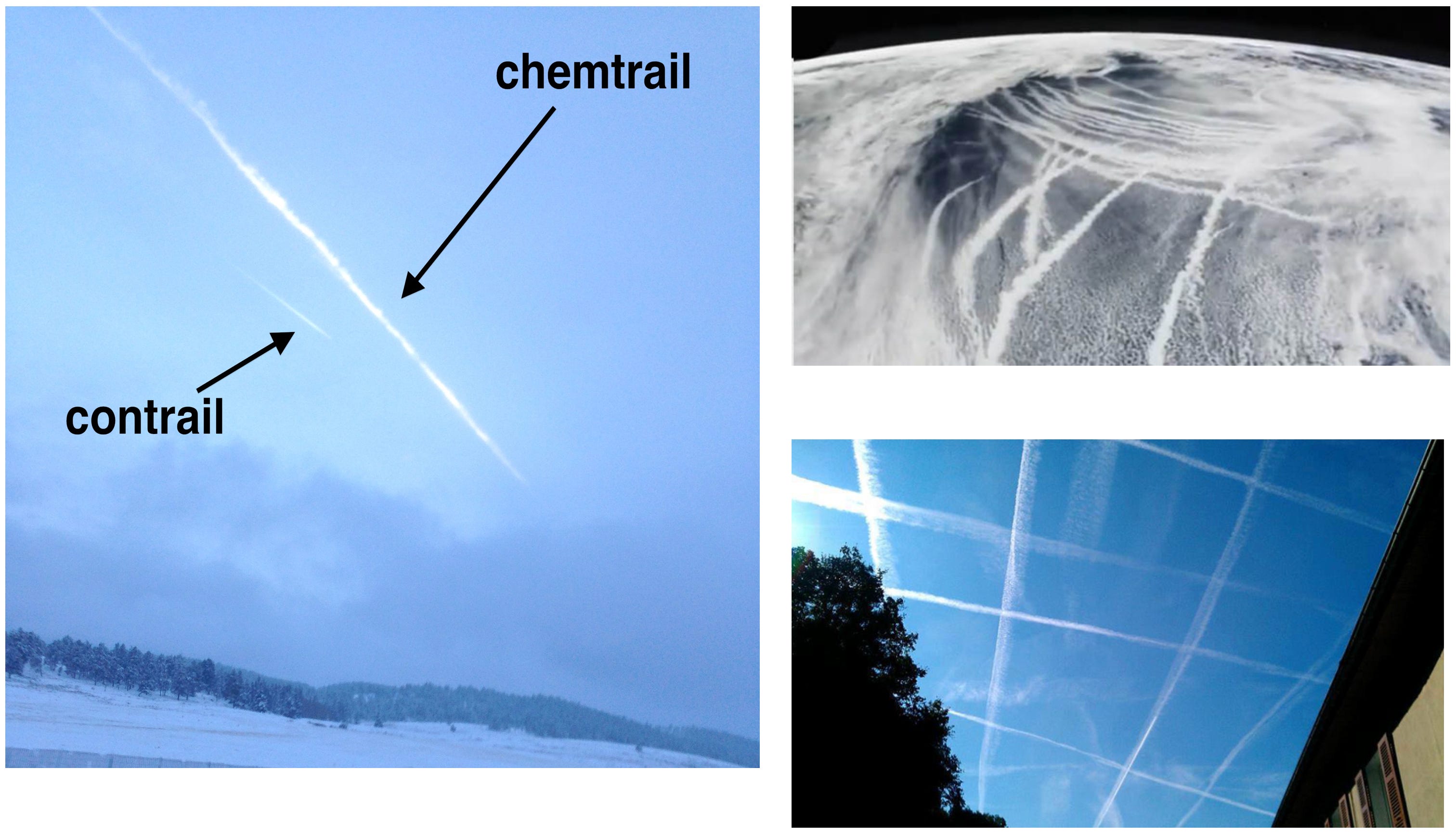 Figure 2: The difference between normal jet contrails and chemtrails. The photograph on the left was taken on 05/01/2016 while traveling northbound on highway 285 about 10 miles south of Fairplay, CO. Before approaching South Park on a snowy day in the mountains, I noticed a slight break in the clouds where there also just happened to be a perfect example of a normal jet contrail right next to a chemtrail. Notice that the plane on the left hand side is leaving behind a very minute trail that is also dissipating as the plane is traveling toward the mountain ridge; then notice the chemtrail that was left behind by a different plane on the right hand side of the photo. This other plane was not present at the time of the photo, indicating that this chemtrail could have been suspended in the sky for hours, which is the very unusual behavior typically seen with these aerosol chemical suspensions. The satellite image on the top right shows a large-scale aerosol dispersion effort. Chemtrails litter the atmosphere in a circular and abnormal pattern. The image on the bottom right displays some of the other unusual patterns that can arise exclusively from chemtrails (Wigington, 2014).