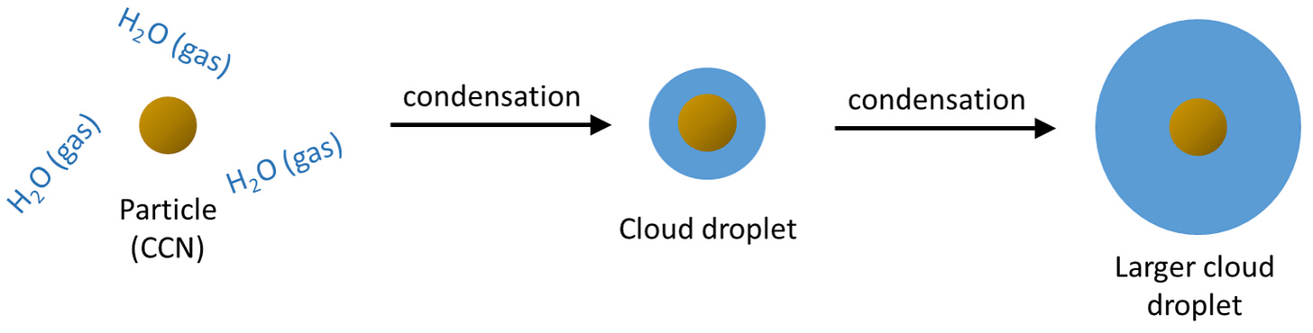 Normal clouds require the following two fundamental properties to form: small particles and the correct moisture regime. By definition, aerosols are colloidal suspensions of particles in a gaseous environment. Clouds do not really form in especially clean air—they require particulate matter called cloud condensation nuclei (CCN), which act as a surface for water vapor to adhere to. The CCN could be dirt, soot, pollution or a number of other particles. To ensure that the nucleation process is effective, size of these nuclei must be extremely small.