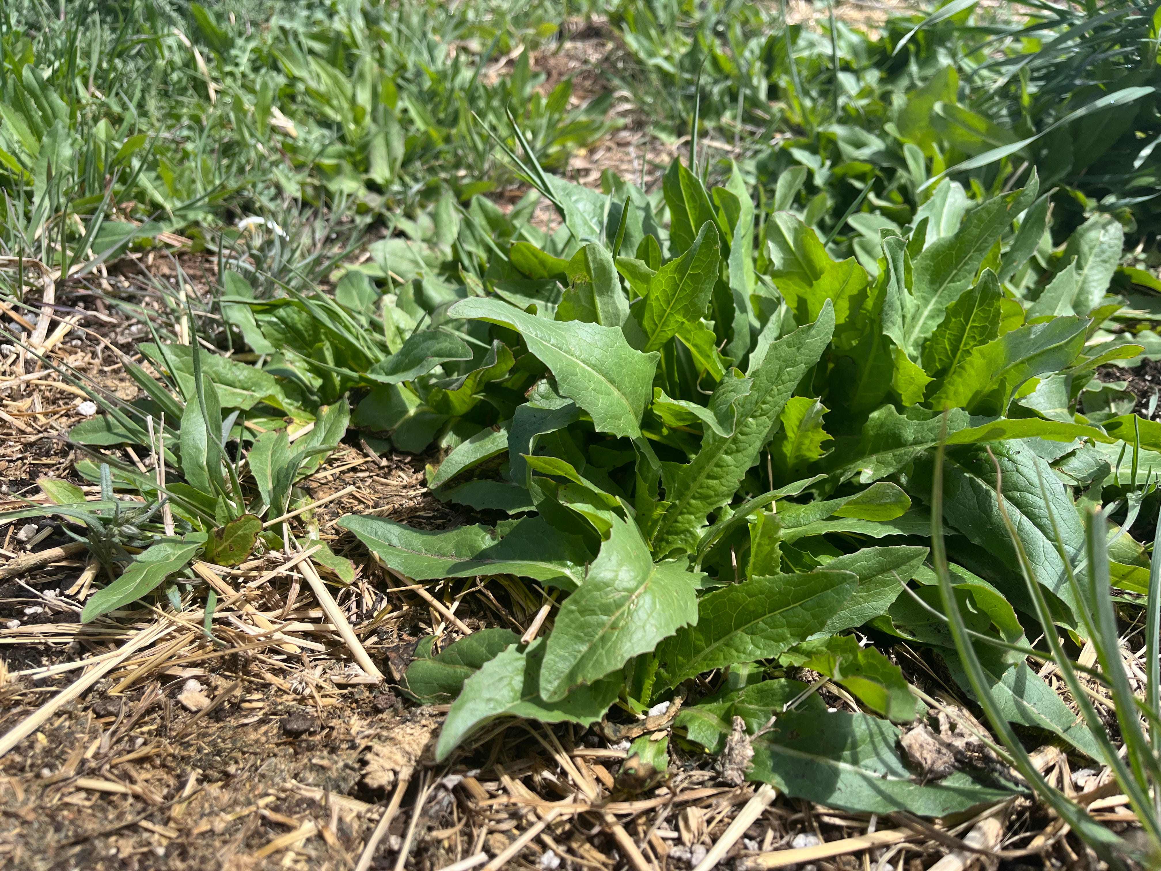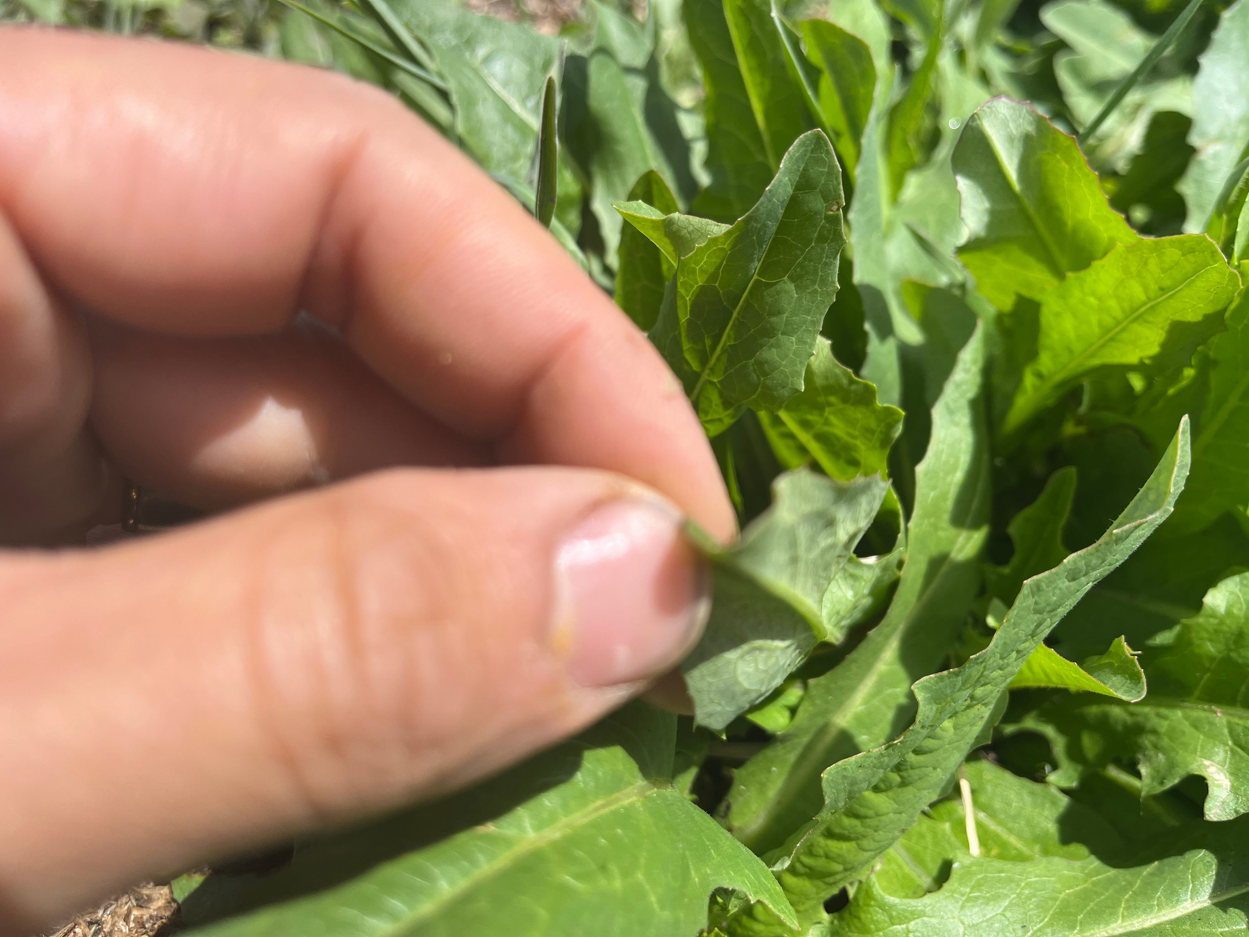 This wild lettuce (Lactuca serriola) is a very beginner-friendly plant to forage because there are no poisonous lookalikes. This is not true of other wild edibles like carrot or onion. In North America, there are about 12 species of wild lettuce. The prickly lettuce pictured above is easy to identify because it has a triangular midrib on the underside of the leaf with fine spines running down the center (you can barely see these in my second photo, but they are there if you zoom in). The only problem with these is bitterness. You want to harvest them in the right growth phase. Look for carpet of prickly lettuce like this one, when they are small and close together fighting for space. They don’t get overly big quickly, they stay small longer, and they don’t get bitter as a result. In other words, baby lettuce greens are the way to go.