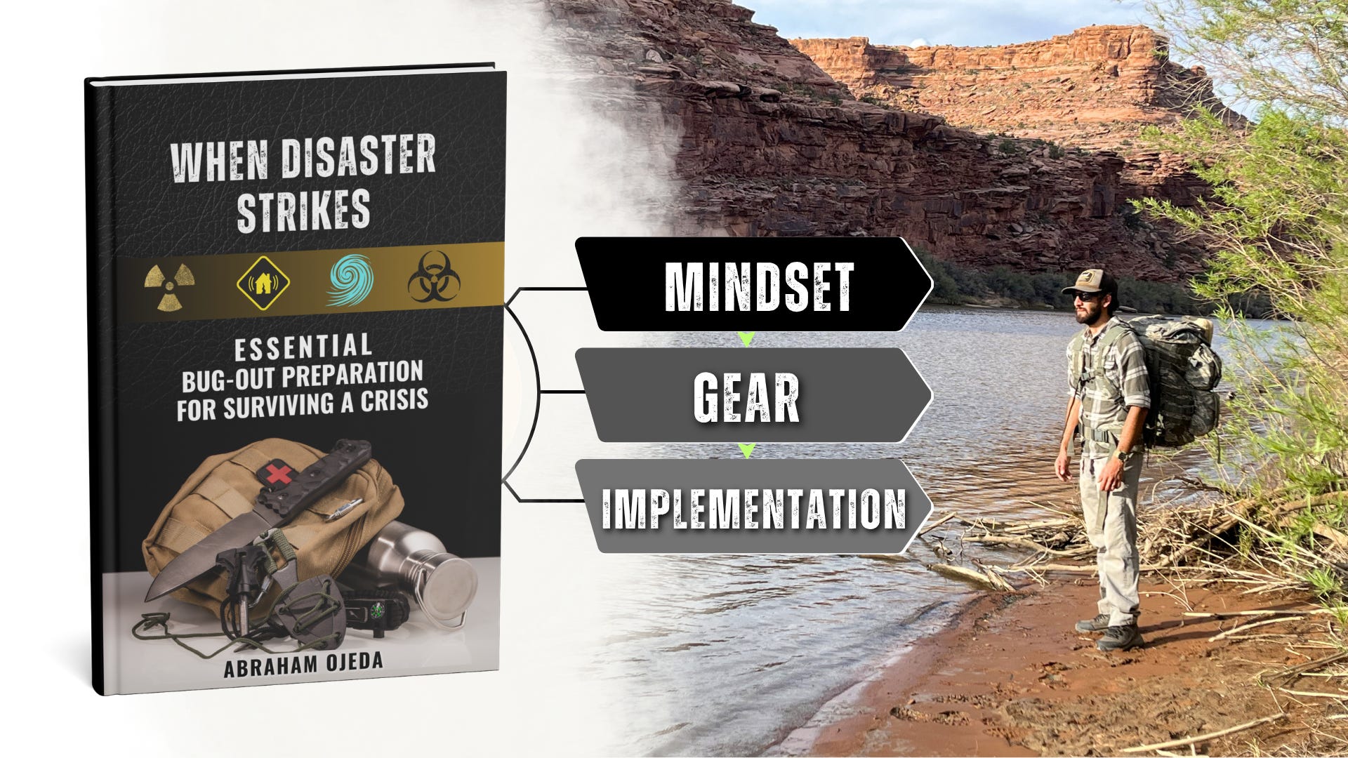 On the right: that’s me with one of my 40 lb bug out bags standing next to the Colorado River. One of the most important aspects of preparedness is Implementation, whereby you practice rucking and basic survival skills regularly to keep your mind, body, and skills sharp.