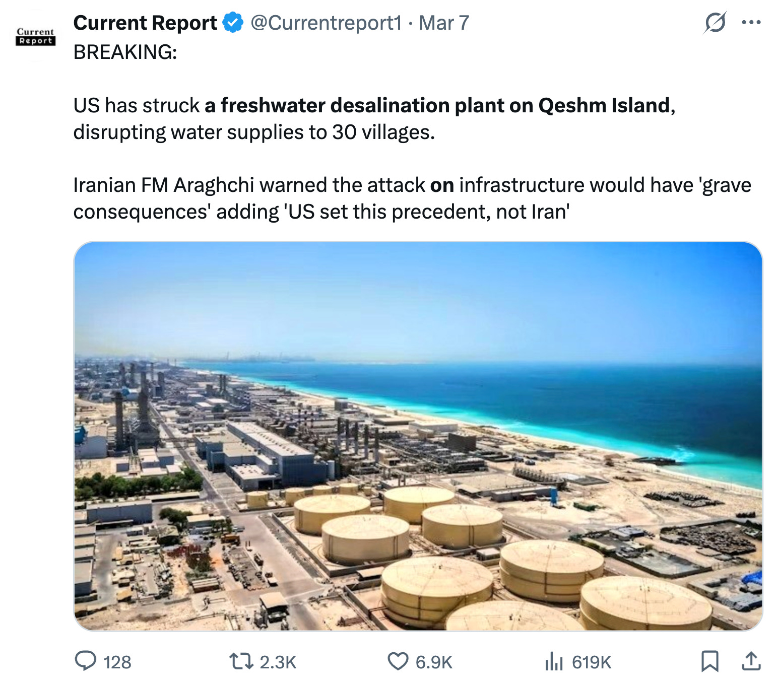 As reported by multiple sources, the attack on Qeshm has disrupted the water supplies to 30 villages. Even though Iran as a whole only depends on desalination plants for 3% of its total drinking water supply, the U.S. and Israel have created a humanitarian crisis in this particular area.