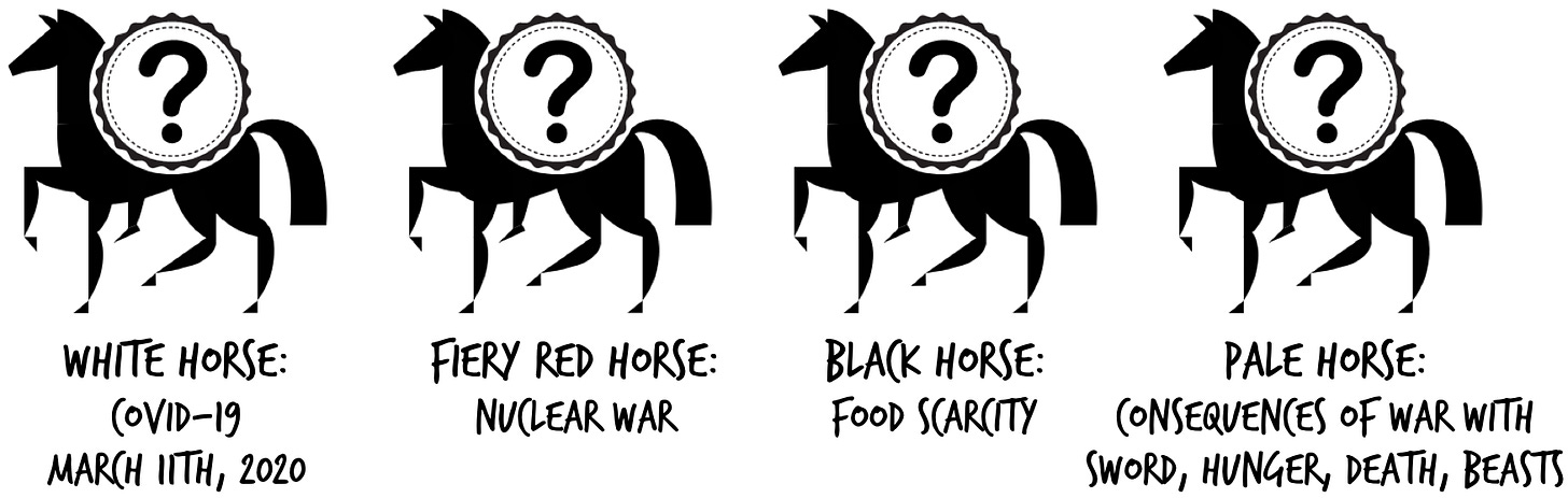 The Four Horseman of the Apocalypse. As explained in Bible Prophecy Secrets,21 the first white horse was Covid-19 when the world was conquered without a single arrow ever fired. Now, we are approaching the fiery red horse of nuclear war, which will lead to the black horse of scarcity worldwide. Concerning the coming black horse, the scripture says: “…do not harm the oil and the wine” - Revelation 6:6