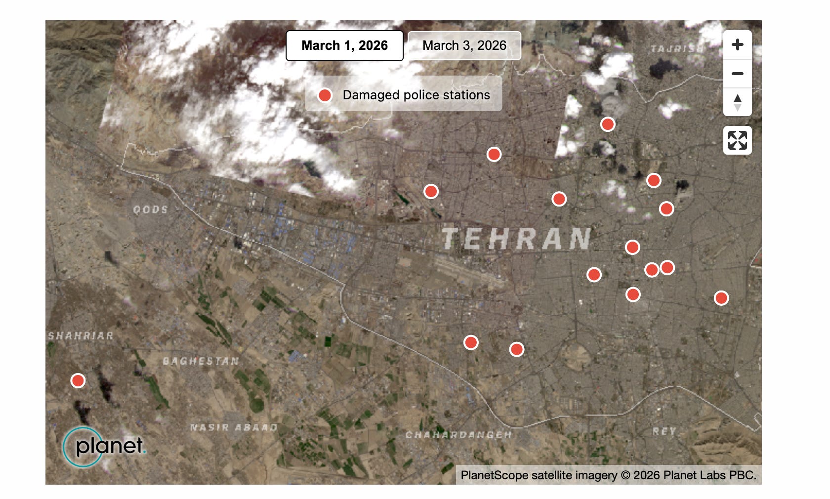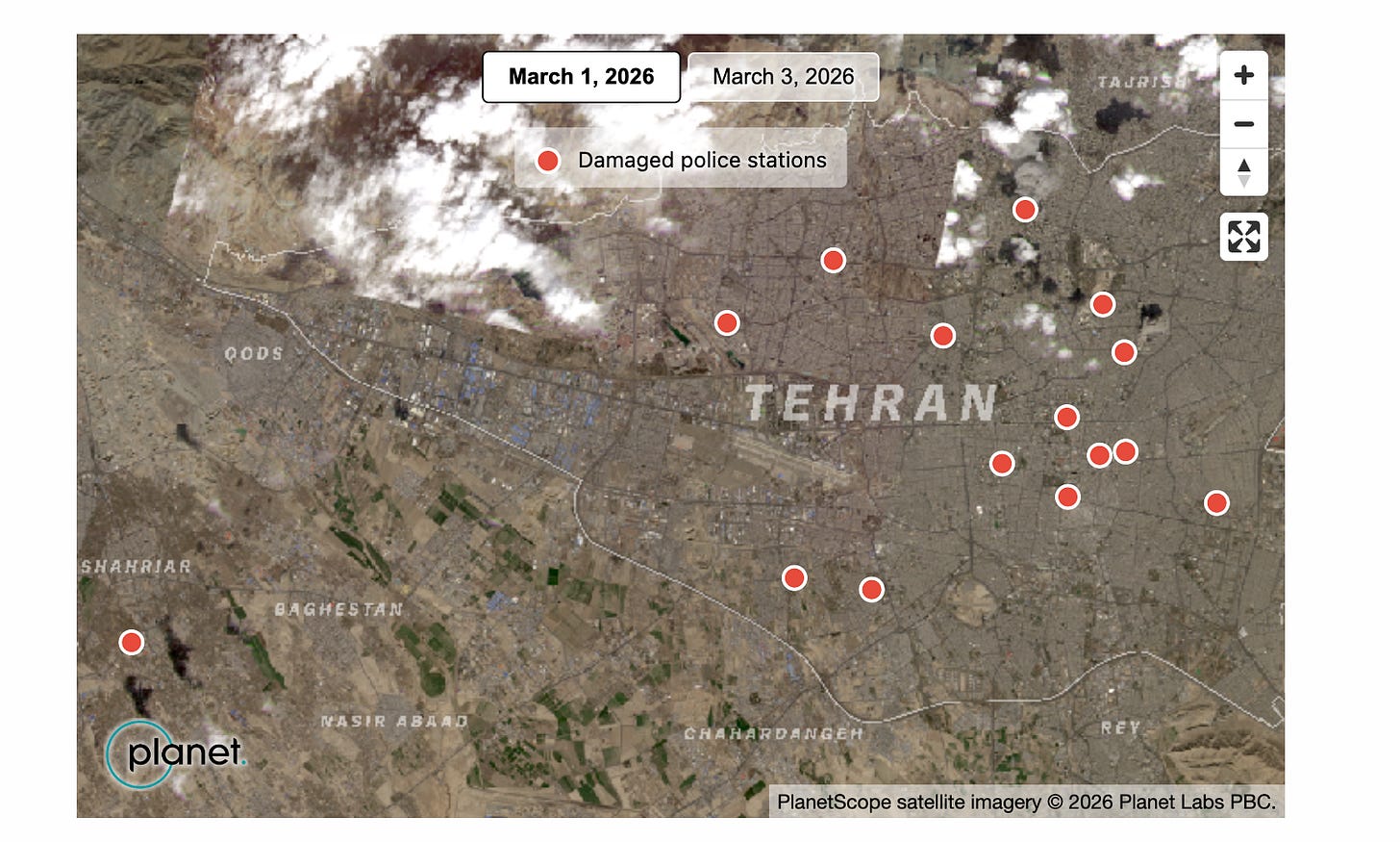 Jake Godin, “Satellite Imagery Reveals Strikes on Iranian Police Stations”, Bellingcat, March 4, 2026, https://www.bellingcat.com/news/middle-east/2026/03/04/satellite-imagery-reveals-strikes-on-iranian-police-stations/